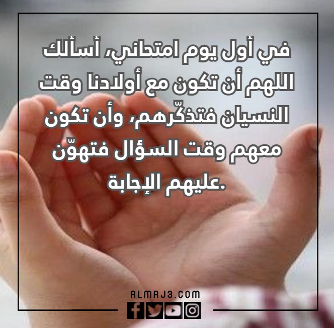 - في أول يوم امتحاني، أسألك اللهم أن تكون مع أولادنا وقت النسيان فتذكّرهم، وأن تكون معهم وقت السؤال فتهوّن عليهم الإجابة.