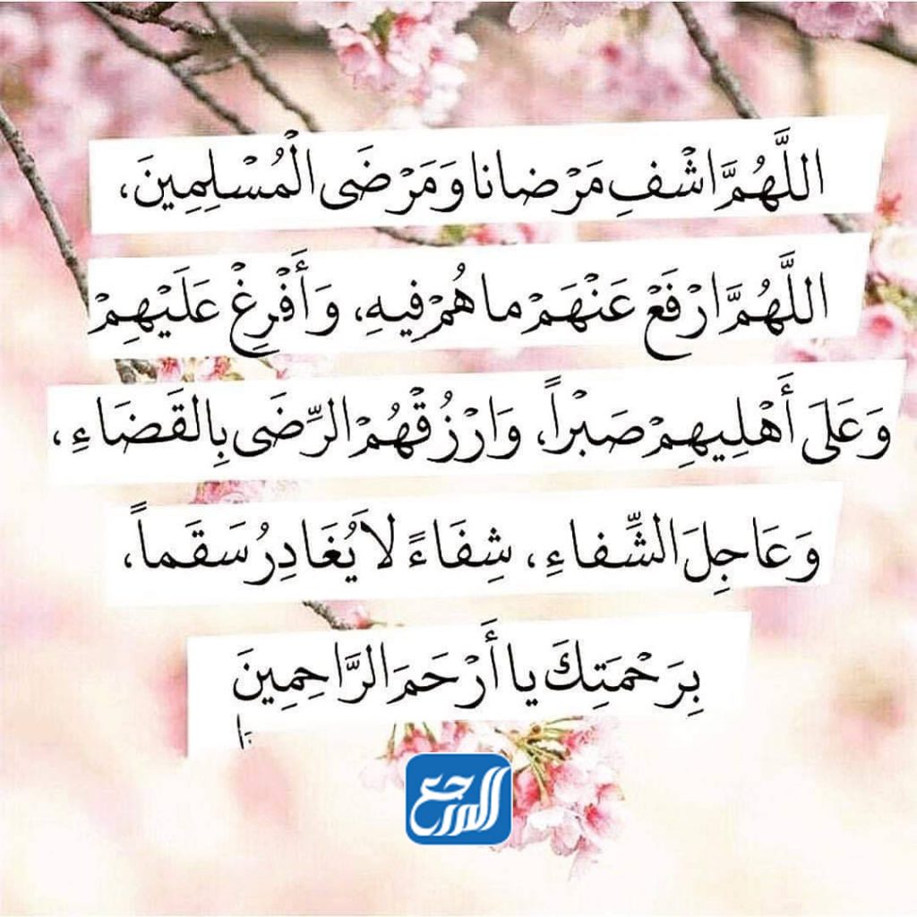 - يا مُفرج الكرب يا مُجيب دعوة المُضطرين، اللهم ألبس كل مريض ثوب الصحة والعافية عاجلًا غير آجلًا يا أرحم الراحمين، اللهم اشفه، اللهم اشفه، اللهم اشفه، اللهم آمين. اللَّهُمَّ إِنَّا نَسْأَلُكَ مِنْ خَيْرِ مَا سَأَلَكَ مِنْهُ نَبِيُّكَ مُحَمَّدٌ صلى الله عليه وسلم وَنَعُوذُ بِكَ مِنْ شَرِّ مَا اسْتَعَاذَ مِنْهُ نَبِيُّكَ مُحَمَّدٌ صلى الله عليه وسلم وَأَنْتَ الْمُسْتَعَانُ، وَعَلَيْكَ الْبَلَاغُ، وَلَا حَوْلَ وَلَا قُوَّةَ إِلَّا بِاللَّهِ.