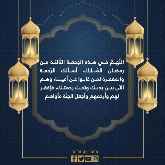 - أسألك يا الله في يوم الجمعة الثالثة من رمضان، أن تجعل من أبكتني الحياة على فراقهم، واشتاقت العين لرؤيتهم، تحت رحمتك وكريم عفوك وغفرانك، فاغفر لهم وأرحمهم واجعل الجنّة منزلتهم.