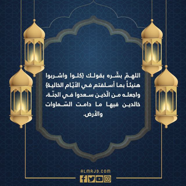 - اللهم أذق أخي حلاوة النَّعيم في جنّاتك، واجعل من الجنّة شرابه وطعامه ولباسه ومأواه، باعد بينه وبين النّار، اللهم إنّه من الحَريصين على كتابك، فاجعله شفيعًا له يوم يلقاك يا رب.