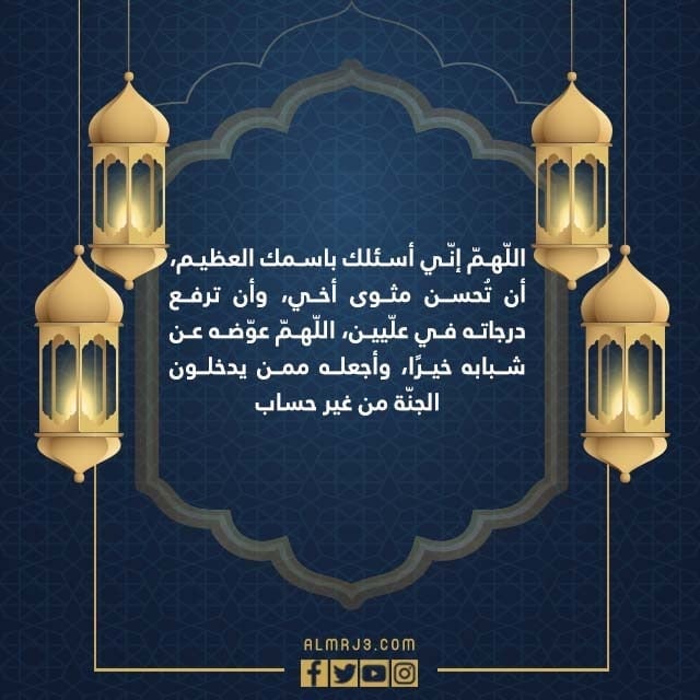 - اللّهمّ إنّي أسألك باسمك العظيم، أن تُحسن مثوى أخي، وأن ترفع درجاته في علّيين، اللّهمّ عوّضه عن شبابه خيرًا، وأجعله ممن يدخلون الجنّة من غير حساب.