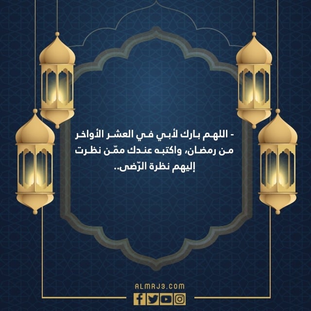 - اللهم مع العشر الأواخر من شهر رمضان أسالك أن لا تدع لأبي ذنبًا إلا غفرته، ولا همًا إلّا فرّجته، اللهم ولا حاجة من حوائج الدّنيا والآخرة إلّا قضيتها برحمتك يا أرحم الرّاحمين، شفّع رسولك المُصطفى فيه، واكتبه عندك من الفائزين.