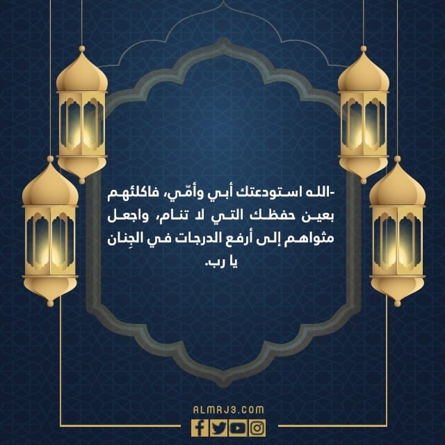 - اللهم يا رحمان السّموات والأرض، يا واسع المُلك، لا إله إلّا أنتَ وحدك، اللهم استودعتك أبي وأمي ومن أحب، فاجعلهم في عين حفظك التي لا تنام، بلّغني وإيّاهم الدّرجات العليا من الجِنان يا حَنَّان يا مَنَّان.