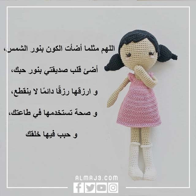 - اللّهمّ اجعل لصديقتي نصيبًا من المغفرة والرّحمة والعتق من النّار، اللّهمّ اجعلها ممن نظرت إليهم فرحمتهم وسمعت دعائها فاستجبت لها، وأكتب لها التّوفيق في الدّنيا والآخرة.