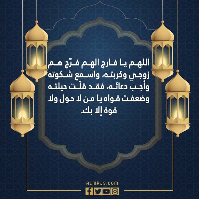 - اللهم يا فارج الهم فرّج هم زوجي وكربته، واسمع شكوته وأجب دعائه، فقد قلّت حيلته وضعفت قواه يا من لا حول ولا قوة إلا بك.