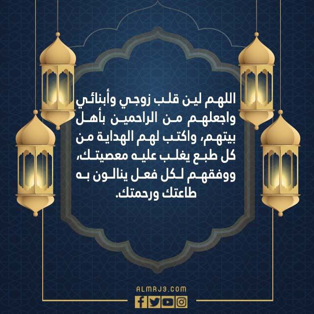 - اللهم لين قلب زوجي وأبنائي واجعلهم من الراحمين بأهل بيتهم، واكتب لهم الهداية من كل طبع يغلب عليه معصيتك، ووفقهم لكل فعل ينالون به طاعتك ورحمتك.