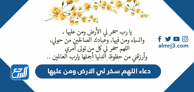 دعاء اللهم سخر لي الارض ومن عليها واحدٌ من الأدعية المهمّة في حياة المسلمين، حيث إنّ الدعاء في حياة المسلم له من الفضل الكثير، ومن فضله أنّه أحبّ الأعمال إلى الخالق -سبحانه وتعالى- وهو العبادة كما أخبر رسول الله صلّى الله عليه وسلّم، لذا يهتمّ موقع المرجع بتقديم دعاء اللهم سخر لي الارض ومن عليها ، بالإضافة إلى جملة من الأدعية التي يمكن للعبد أن يستعين بها على تسخير الخلق لغاياته بما يرضي الله سبحانه وتعالى.