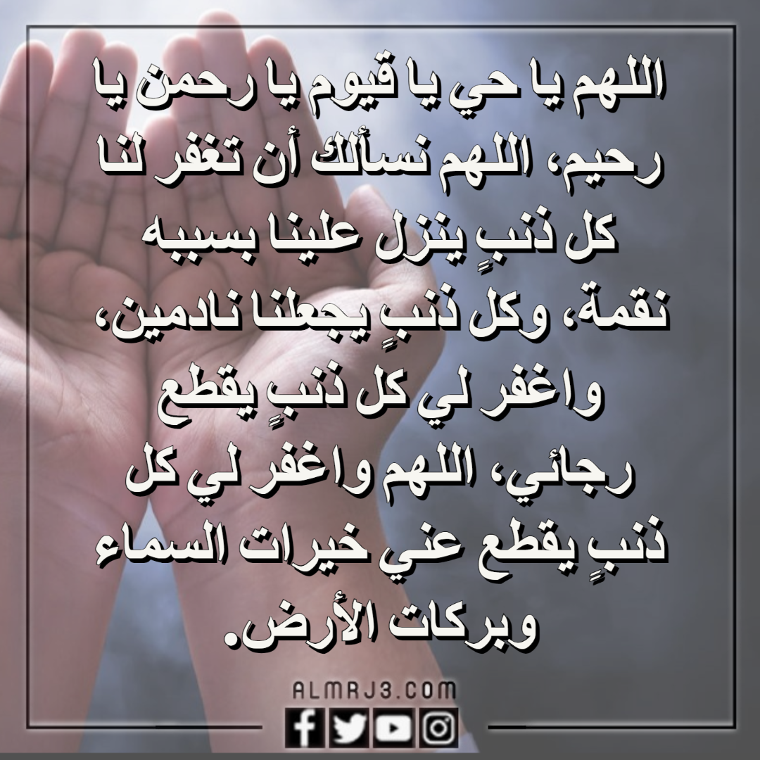 | دعاء لقضاء الحوائج | اللهم يا حي يا قيوم يا رحمن يا رحيم، اللهم نسألك أن تغفر لنا كل ذنبٍ ينزل علينا بسببه نقمة، وكل ذنبٍ يجعلنا نادمين، واغفر لي كل ذنبٍ يقطع رجائي، اللهم واغفر لي كل ذنبٍ يقطع عني خيرات السماء وبركات الأرض. |