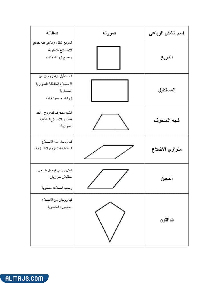 إنّ لكل شَكل رُباعي من الأشكال الهندسيّة المكونة من أربعة أضلاع خصائص مختلفة عن الشّكل الرُّباعي الآخر، من حيث تطابق الأَضلاع وتعامدها وتَوازيها؛ وكذلك الأمر بالنسبة للزوايا الأربع الناتجة عن تقاطع القطع المستقيمة الأربعة، وقد جاءت خصائص وصفات الأشْكال الرّباعيّة موضحة كما في الصور التالية: