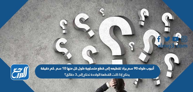 أنبوب طوله ٩٠ سم يراد تقطيعه إلى قطع متساوية طول كل منها ١٠ سم .كم دقيقة يحتاج إذا كانت القطعة الواحدة تحتاج إلى ٣ دقائق؟ نستخدم لإجابة هذا السؤال بعض العمليات الحسابية المختلفة عن بعضها حتى نصل إلى الحل الصحيح، ويوضح موقع المرجع من خلال هذا الموضوع طريقة حل هذه المسألة وإجابتها النهائية الصحيحة، كما سيتم توضيح أشهر صيغ الأسئلة التي يمكن أن يتم صياغة هذا السؤال بها.