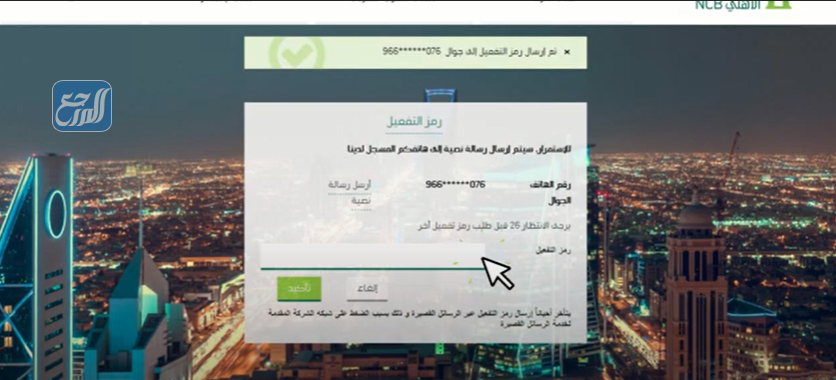 - إدخال رمز تفعيل الحساب المرسل الى رقم جوال العميل المسجل في بنك الأهلي السعودي كما في الشكل.