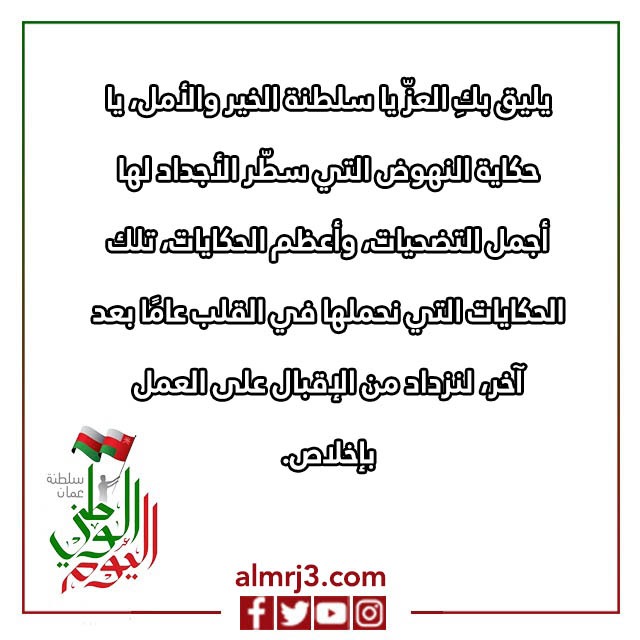 يهتم المُواطنون في سلطنة عُمان بتلك المناسبة الوطنيّة المميّزة، وعن ذلك الإتمام يتم تناولها بكثير من الكلمات والمشاعر الأنيقة، التي نسرد لكم منها الباقة المميّزة الآتية: