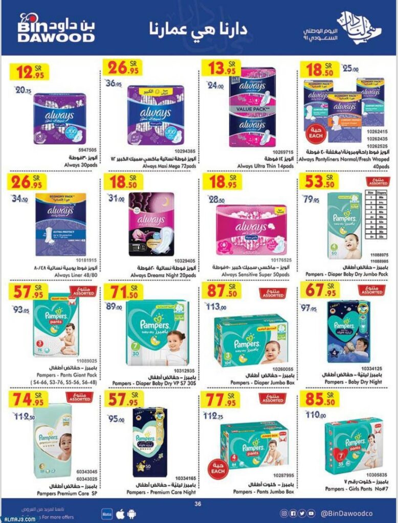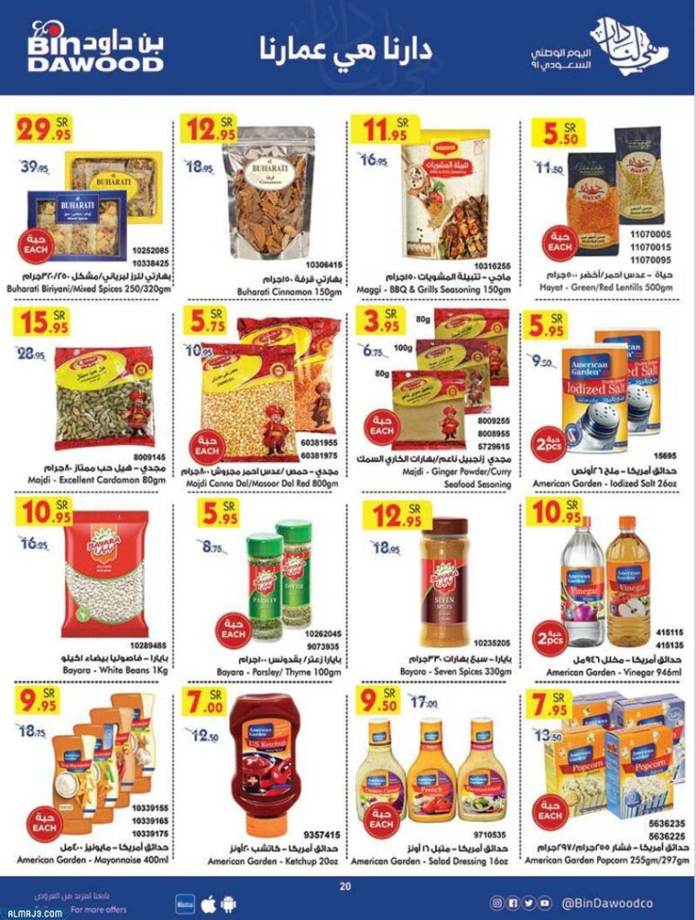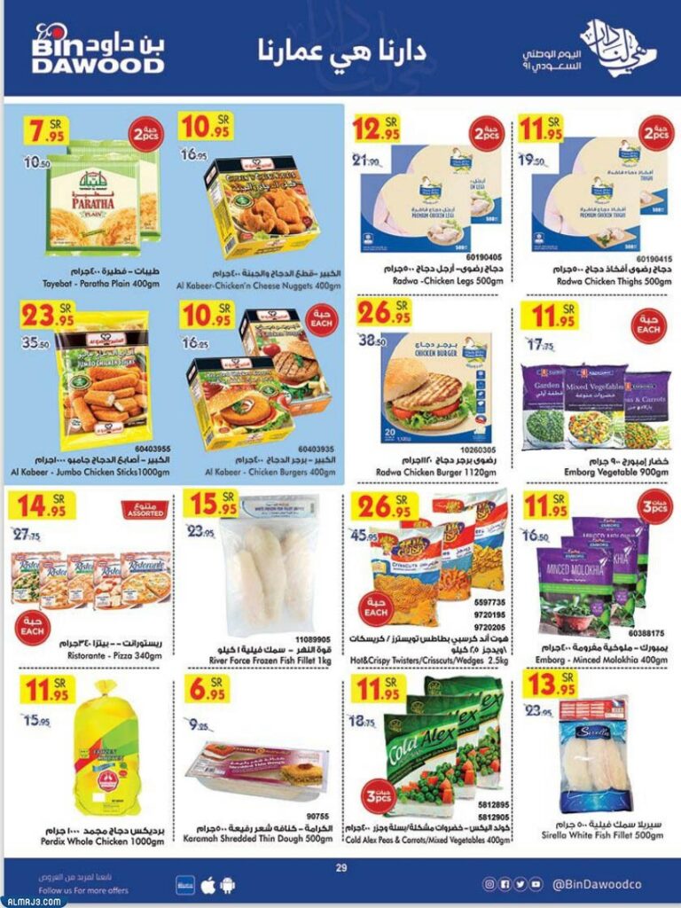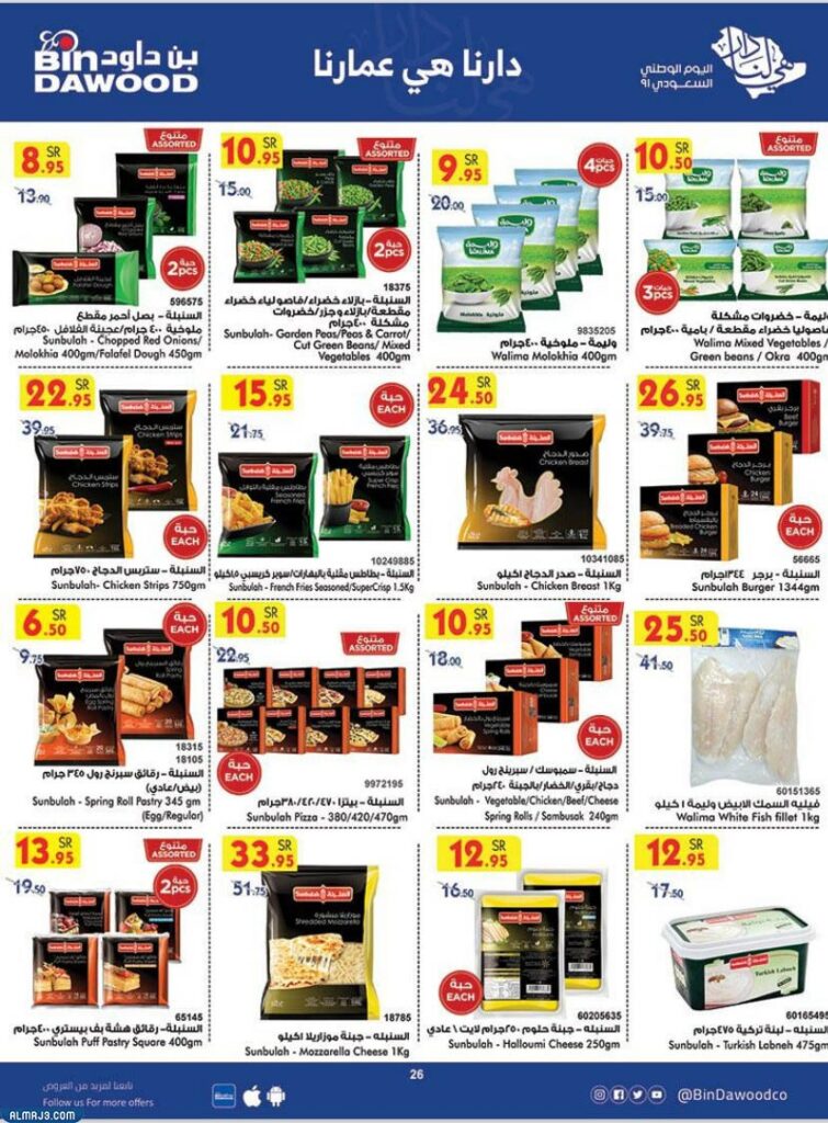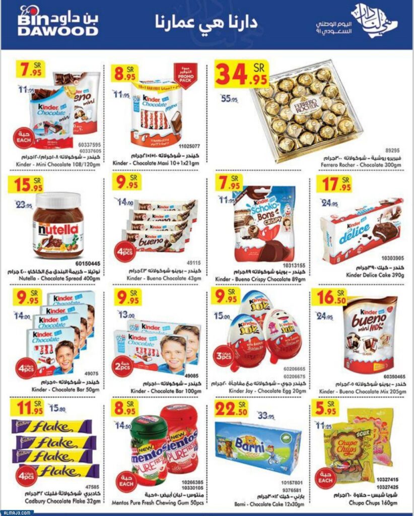 أعلنت متاجر بند داود لتجارة التجزئة العديد من العروص والخصومات على كافة المنتجات الموجودة بها خلال شهر سبتمبر من كل عام باليوم الوطني، احتفالاً باليوم الوطني السعودي بتوحيد المملكة، كما تلقى تلك العروض إقبالًا كبيرًا من قِبل المواطنين والمقيمين في السعودية، وفي هذا الصدد خصصت متاجر بن داود كتيب خصومات لكافة متاجرها في جدة، ومكة، والمدينة المنورة، وخميس مشيط.، جاءت عروض بن داود لليوم الوطني 91 لعام 1443هــ والتي تشمل مجموعة كبيرة من تصنيفات السلع الغذائية، والأجهزة الكهربائية، والمشروبات ومنتجات الألبان، واللحوم، ومنتجات العناية الشخصية، والأدوات المنزلية، وأجهزة الحاسوب والمحمول، وكافة السلع الأخرى، حيث تتعدّد العروض والخصومات فتتراوح نسبة الخصم ما بين 10% إلى 50%، ويمكنك استعراض كتيب عروض جدة “من هنا“، ومن أبرز ما جاء في تلك العروض ما يلي: