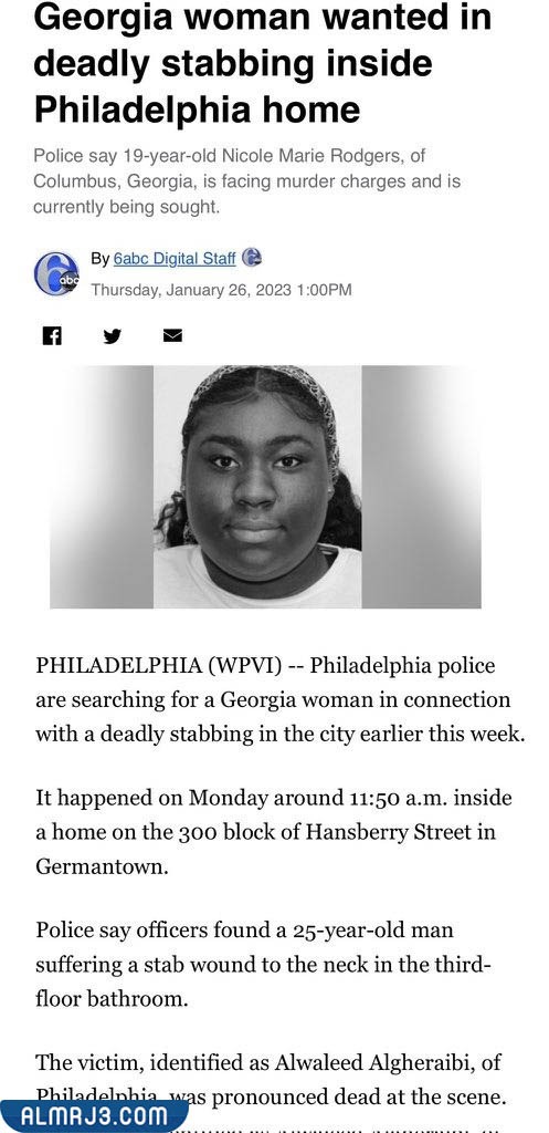 لقد صرحت الشرطة الأمريكية بأنها اعتقلت فتاة سوداء من ولاية جورجينا على خلفية مقتل المبتعث السعودي، وقد أكدت الشرطة أن نيكول ماري رودجرز، البالغة من العمر 19 عامًا، والمنحدرة من مدينة كولومبوس بولاية جورجيا، محتجزة الآن لديها، وقد وجهت لها الشرطة تهمة الاعتداء على الشاب السعودي والقتل العمد والسطو المسلح والعديد من التهم الأخرى، ولم يتم إدانتها حتى الآن.[1]