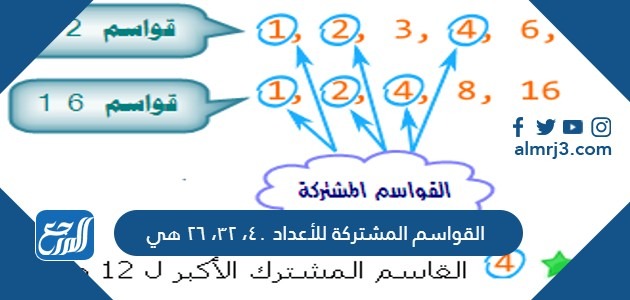 من اللازم إجراء عملية حسابية، تعمل على أساس المقارنة بين كسور الأرقام، حتى يتم التعرف على القاسم المشترك لكل منها، والإجابة الصحيحة لسؤال مجموعة القواسم المشتركة الخاصة بالأعداد ٤٠، ٣٢، ٢٦ هي: