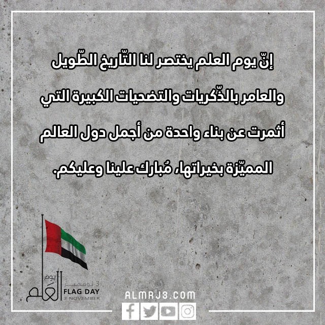 | العبارة الرّابعة | تُسافر بنا مناسبة يوم العلم الإماراتي إلى صفحات التّاريخ الجميلة، تلك التي نتعرف بها على قاداتنا الأبطال، وذكريات البناء الأولى، وحقيقة الحكمة التي كانت سببًا في بناء الأرض، وإعمار الوطن، مُبارك علينا وعليكم. |