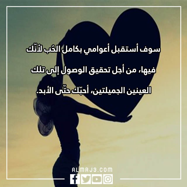 | My beautiful love, oh the story of the moon with which God enlightened the darkness of my heart, at the beginning of the new year I bless you, and I ask God to make us many beautiful memories in it, so it will be the year in which we meet until the end of life. | حبيبتي الجميلة، يا حكاية القمر التي أنار الله بها ظلمات قلبي، في بداية العام الجديد أُبارك لك، وأسأل الله ان يجعل لنا فيه الكثير من الذّكريات الجميلة، فيكون العام الذي نلتقي فيه حتّى نهاية العُمر. |