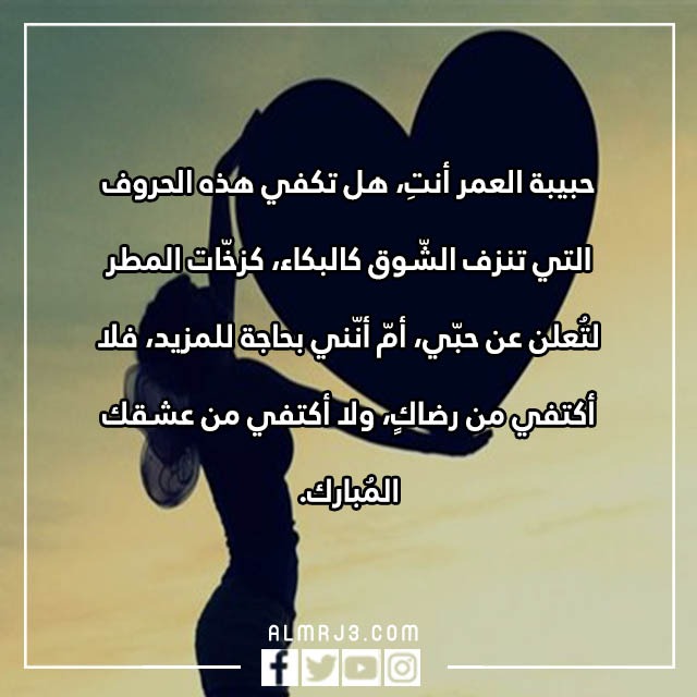 - حبيبة العمر أنتِ، هل تكفي هذه الحروف التي تنزف الشّوق كالبكاء، كزخّات المطر لتعلن عن حبّي، أمّ أنّني بحاجة للمزيد، فلا أكتفي من رضاكٍ، ولا أكتفي من عشقك المُبارك، أسأل الله أن يكتب لنا في هذا العام كلّ الخير والسّعادة.