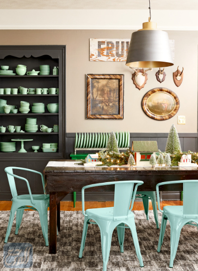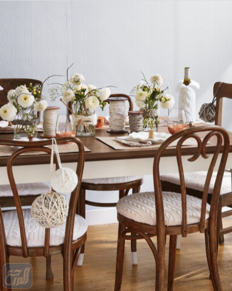 يُمكن استخدام بكرات وخيوط الصوف من اجل تزيين غرفة المعيشة وخصوصًا الطاولات؛ حيث يُمكن أن يتم لف خيوط الصوف حول كرات كبيرة الحجم وحول الزهريات كما يمكن ربط كرات الصوف والغزل على ظهر المقاعد مع إمكانية تغطية المقاعد بأقمشة من الصوت أيضًا لخلق لمسة ديكورية فنية مميزة على السفرة كما يظهر في الصورة التالية: