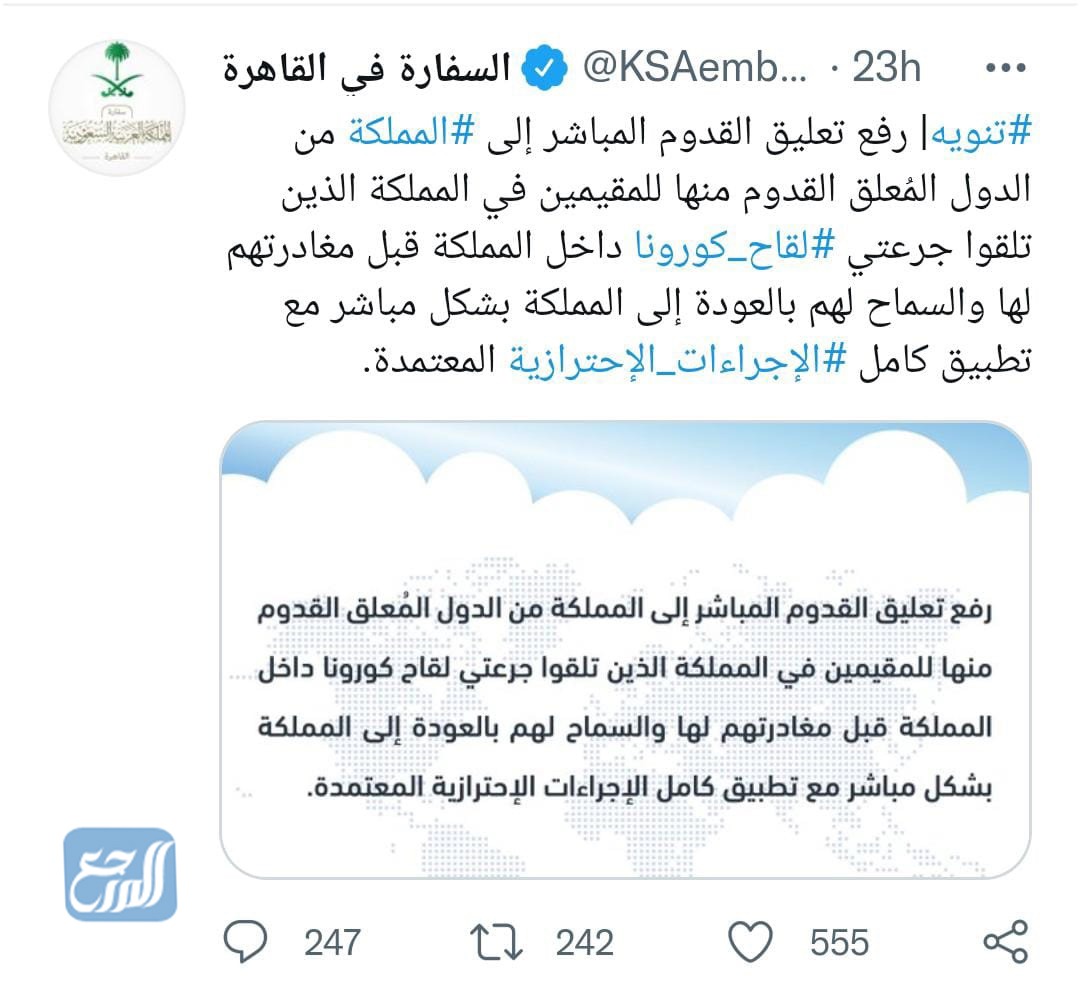 رفعت السعودية أمس الثلاثاء 24 أغسطس 2021، تعليق القدوم المباشر إلى المملكة من الدول المعلق القدوم منها، للمقيمين الذين تلقوا جرعتي لقاح كورونا داخل المملكة قبل مغادرتهم، مما يعني عودة الطيران السعودي إلى مصر بشكل مباشر للمقيمين، بالإضافة إلى 8 دول أخرى تحظر السعودية استقبال القادمين منها وهي لبنان وتركيا والأرجنتين والبرازيل وإندونسيا وجنوب إفريقيا وباكستان والهند، وكانت قد أعلنت الصفحة الرسمية للسفارة السعودية في القاهرة عبر موقع تويتر وكتبت: “رفع تعليق القدوم المباشر إلى المملكة من الدول المُعلق القدوم منها للمقيمين في المملكة قبل مغادرتهم لها والسماح لهم بالعودة إلى المملكة بشكل مباشر مع تطبيق كامل الإجراءات الاحترازية المعتمدة”.