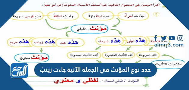 حدد نوع المؤنث في الجملة الآتية جاءت زينبُ، من النِّقَاط التي يتم طلب الإجابة عليها من طلاب المرحلة المتوسطة في المملكة العربية السُّعُودية في اللغة العربية، ويحتاج الطالب إلى معرفة الجواب الصحيح لها، وفي موقع المرجع نتعرف على ذلك الجواب وأنواع المؤنث وأقسامه.