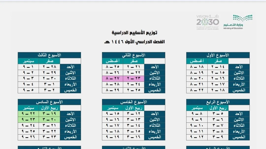 إنّ توزيع الاسابيع الدراسية 1446 وورد هو ما سنقوم على طرحه عبر فقرات وسطور هذا المقال، حيث أعلنت وزارة التّعليم عن طرح الخطّة الدراسيّة الجديدة ليبدأ تطبيقها مع بداية العام الدّراسي الجَاري، وتسعى الوزارة إلى عودة نظام التّعليم الوجاهيّ في كافّة مؤسسات التعليم من مدارس وجامعات على امتداد حدود المملكة العربيّة السعوديّة بدلًا من التعليم عن بعد، وعملت على إضافة جملة من التعديلات المهمّة للأعوام القادمة، وعبر موقع المرجع يمكن للطالب العزيز أن يتعرّف على التقويم الدراسي بالاسابيع وعلى توزيع الأسابيع الدراسية للعام 1446 .