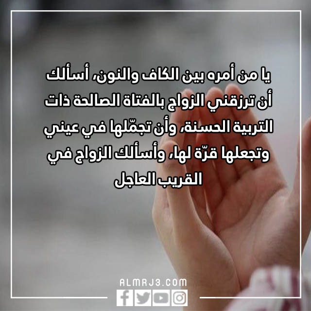 - اللهم لا ملجأ لي سواك، فأنت القادر على كل شيء، يا من أمره بين الكاف والنون، أسألك أن ترزقني الزواج بالفتاة الصالحة ذات التربية الحسنة، وأن تجمّلها في عيني وتجعلها قرّة لها، وأسألك الزواج في القريب العاجل.