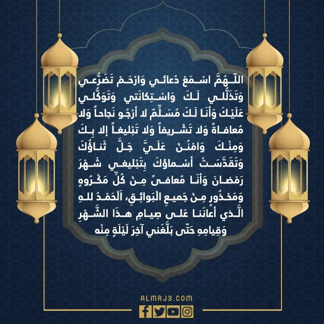 اللهم لك الحمد كله ولك الشكر كلّه، ولك يرجع الأمر كلّه علانيته وسرّه، اللهم إنا نسألك أن تجعل ختام شهر رمضان مغفرةً لكلّ ذنوبنًا وخطايانا، اللهم إنا نستودع شهر رمضان المبارك اللهم أعده علينا باليمن والبركة، اللهم لك الحمد بالإيمان ولك الحمد بالقرآن، اللهم قد أظهرت أمننا وجمعت فرقتنا، اللهم ومن كلّ ما سألناك أعطيتنا، اللهم اقسم لنا في نهاية رمضان من خشيتك ما تحول بيننا وبين معصيتك، ومن طاعتك ما ترزقنا به جنتك، ومتعنا اللهم بأسماعنا وأبصارنا، وقواتنا أبدًا ما أبقيتنا واجعله الوارث منا، اللهم انصرنا على من عادانا ولا تجعل مصيبتنا في ديننا ولا مبلغ علمنا ولا إلى النار مصيرنا، واجعل اللهم الجنة دارنا وقرارنا، اللهم يا من تسمع كلامنا وترى مكاننا وتعلم سرنا وجهرنا، لا إله إلا أنت سبحانك إنا كنا من الظالمين، اللهم ارزقنا الجنة في نهاية رمضان وما قرب إليها من قولٍ وعمل، اللهم وأعذنا فيه من النار وما قرب إليها من قولٍ أو عمل، لا إله غيرك، بأسمائك الحسنى وصفاتك العلا أن تغفر لنا وتبلغنا رمضان القادم برحمتك يا أرحم الراحمين.