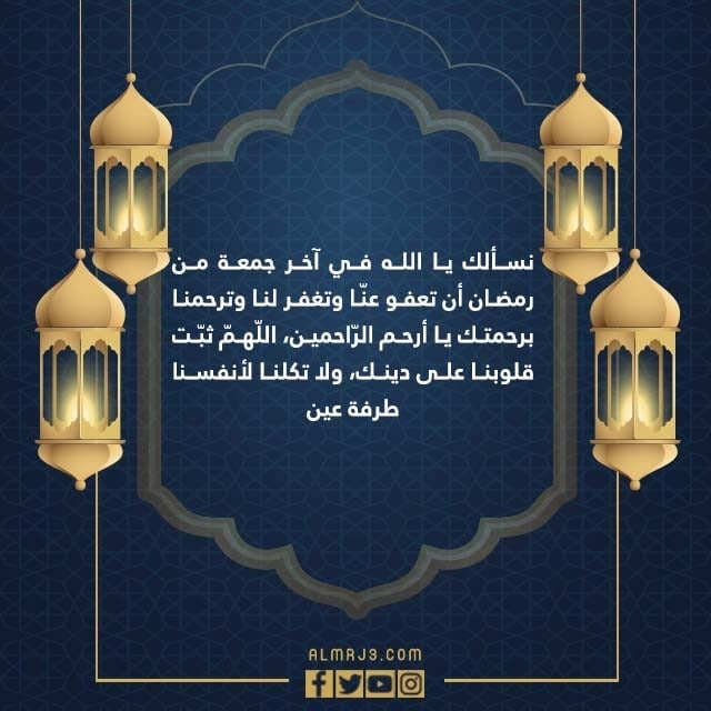 - اللّهمّ اجعل لنا في آخر جمعة من رمضان بركةً في الوقت وأكرمنا حسن القيام في الختام، واجعلنا من الّذين أحسنوا الصّيام والقيام في شهرك الفضيل، وتقبّل منّا واغفر لنا إنّك أنت الغفور الرّحيم.