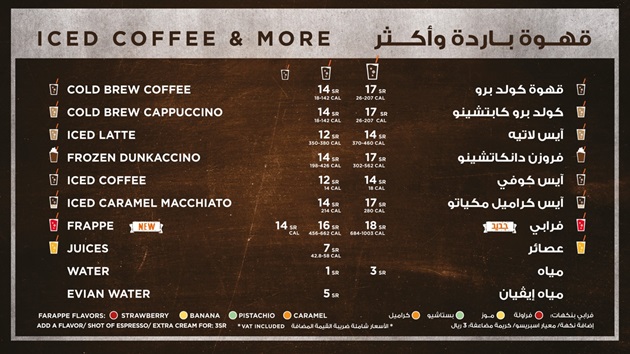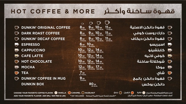 إن قائمة مطعم دونات دانكن هي قائمة شاملة ومتنوعة تضم كل ما يبحث عنه الفرد من مشروبات وحلوى وأطعمة وحلوى لذيذة، حيث نجد أن المطعم يُقدم جميع أنواع القهوة الساخنة والاسبرسو والكابتشينو واللاتيه، ويُقدم كل أنواع القهوة الباردة والعصائر والمشروبات، كما يُقدم المطعم العديد من أنواع المعجنات والسندوتشات والتوست والبيجل، وهذا إلى جانب الحلوى الأساسية في المطعم وهي مختلف أنواع الدونتس، وتأتي محتويات دونات دانكن منيو والأسعار أيضًا لفرع محلات دونات دانكن في المملكة العربية السُّعُودية على النحو الموضح في الصور التالية: