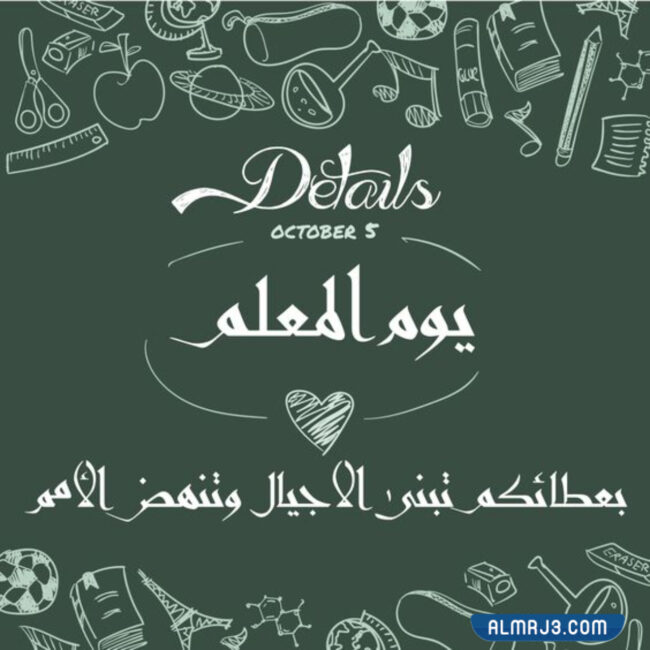 يتم الاحتفال بالمعلم في الخامس من أكتوبر لكل عام ميلادي، ويحرص الطلاب على مشاركة الصور التي تعبر عن امتنان الطلاب وأولياء الأمور بدور المعلمين، وخلال مشاركة تلك الصور يتم إضافة عبارات وأبيات من الشعر بمناسبة اليوم العالمي للمعلم، وفيما يلي سنعرض لكم بعض العبارات التي يمكن الاستعانة بها: