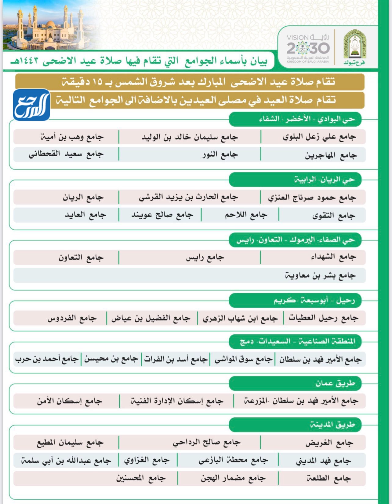 مساجد وجوامع صلاة عيد الاضحى في تبوك 1443