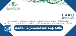 يتميز تصميم بِطاقة تَهنئة عِيد الفطْر لمَنسوبي وَزارة الصِحة السعودية بالرُقي في اختيار التصاميم الهادئة، والكلمات الطيبة والمُباركات الرسمية، وفيما يلي نعرض لكم بِطاقة تَهنئة العِيد لمنسوبي وَزارة الصِحة: