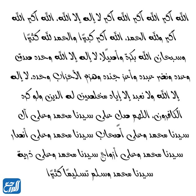 - “الله أكبر الله أكبر الله أكبر لا إله إلا الله الله أكبر الله أكبر ولله الحمد الله أكبر كبيرًا والحمد لله كثيرًا وسبحان الله بكرة وأصيلًا لا إله إلا الله وحده صدق وعده ونصر عبده وأعز جنده وهزم الأحزاب وحده لا إله إلا الله ولا نعبد إلا إياه مخلصين له الدين ولو كره الكافرون اللهم صل على سيدنا محمد وعلى آل سيدنا محمد وعلى أصحاب سيدنا محمد وعلى أنصار سيدنا محمد وعلى أزواج سيدنا محمد وعلى ذرية سيدنا محمد وسلم تسليمًا كثيرًا الله أكبر الله أكبر الله أكبر لا إله إلا الله الله أكبر ولله الحمد”.