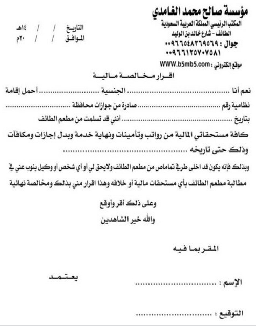 نموذج مخالصة باستلام جميع مستحقات عامل جاهز للطباعة