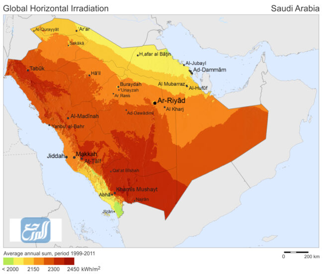 تتميز المملكة العربية السعودية بالعديد من المقومات والموارد التي يتم استغلالها لتطوير الحالة الاقتصادية للمملكة، ومن ضمن مواردها القوية مجال الطاقة الشمسية، فنظرًا لموقعها الجغرافي المميز استحوذت على قدر كبير من الطاقة الشمسية التي يتم الاعتماد عليها بشكل كبير في توليد الطاقة، وفيما يلي سنعرض لكم خريطة توضيحية للإشعاع الشمسي في المملكة: