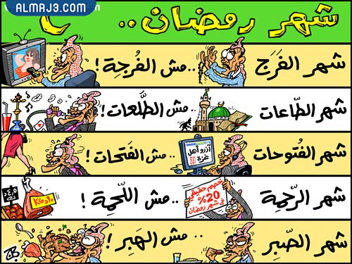 يُعبر البعض من رواد مواقع التواصل الاجتماعي في نهار رمضان عن إرهاق الصيام من خلال الصور والكوميكات المُضحكة والكوميدية، والتي تتميز بتصاميم الكاركاتير لشخصيات سلبية لا تغتنم رمضان بشكل صحيح، وفيما يلي نعرض لكم صُوَر مُضْحِكة عن شَهْر رَمَضان: