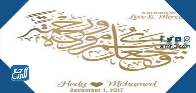 - سم الله الرحمن الرحيم “وَمِنْ آيَاتِهِ أَنْ خَلَقَ لَكُم مِّنْ أَنفُسِكُمْ أَزْوَاجًا لِّتَسْكُنُوا إِلَيْهَا وَجَعَلَ بَيْنَكُم مَّوَدَّةً وَرَحْمَةً ۚ إِنَّ فِي ذَٰلِكَ لَآيَاتٍ لِّقَوْمٍ يَتَفَكَّرُونَ”،[4] تهنئة مغموره بأجمل معاني الحب ومزينه بأصدق مشاعر الأخوه ومحاطه بأقوی جسور الصداقه تهنئة منبعها القلب تهنئة مفعمة بالحب ابعثها اليك حبيبي “فلان” لك ترق احلى الكلمات وتتهادى اصدق الدعوات ولك يهتف الفؤاد زواج مبارك وبالرفاه والبنين.