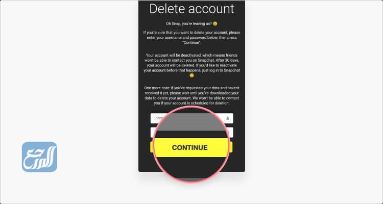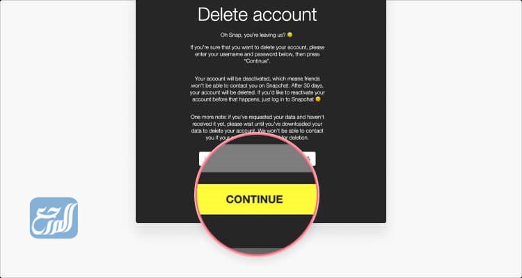 - يتم الانتقال إلى صفحة حذف الحساب، كل ما على المستخدم عمله هو كتابة اسم المستخدم وكلمة المرور الخاصين به والضّغط على “متابعة / continue”، وعندها سيتم وضع حسابه في فترة الاسترداد التي تبلغ 30 يومًا، وعلى المستخدم ألا يقوم بلمس تسجيل الدخول مرة أخرى وسيتم حذف الحساب بعد شهر.