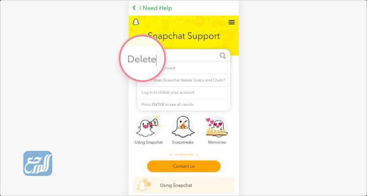 - يتم الانتقال إلى صفحة دعم السناب شات، ومن ثمّ في شريط البحث أعلى الصفحة يتم كتابة “حذف / Delete” ويتم تحديد الخيار الأول الذي يظهر وهو “حذف حسابي / Delete my account”.