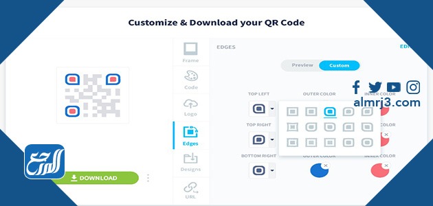 يتاح للعملاء اختيار الحواف مع مراعاة الحفاظ على الشكل المربع للباركود لضمان جودة المسح الضوئي ويمكن للمستخدم اختيار ألوان الحواف بعناية وينصح اختيار ألوان غامقة للحواف مقابل للون الغامق لقلب الباركود كما في الصورة.