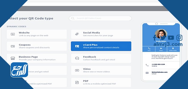 - اختيار نوع الباركود المفضل للمستخدم ضمن القائمة المتاحة والتي تتضمن انشاء باركود لمواقع الويب أو للكوبونات أو لصفحة أعمال أو لمواقع التواصل الاجتماعي أو غيرها .