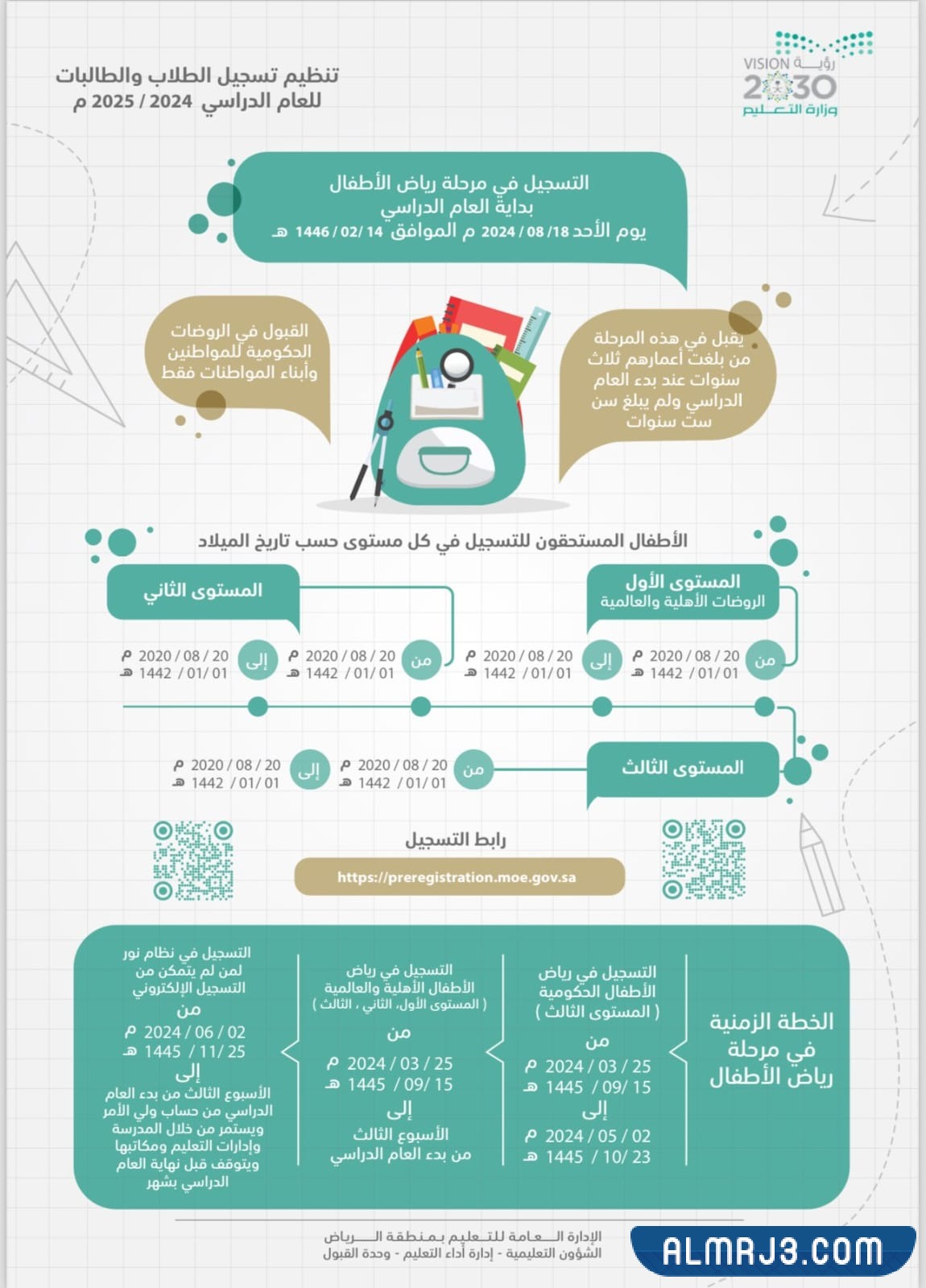 - للتّسجيل في رياض الأطفال: يجب ألا يقل عُمر الأطفال عن ثلاث 3 سنوات، ولا يصل إلى عمر الصف الأول.