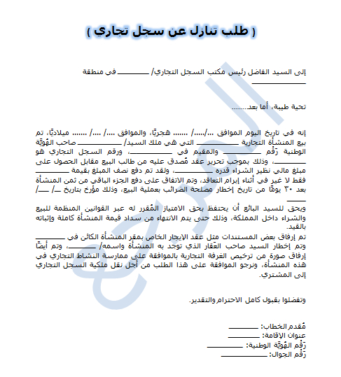 - لابدّ أن يقدّمُ المالك القديم للمنشأة الخطاب الذي يتضمن التنازل عن السجل تجاري مع ضرورة وجود شهود على الخطاب.
