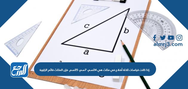 إذا كانت قياسات ثلاثة أضلاع في مثلث هي ٢٤سم، ٧سم، ٢٥سم. فإن المثلث قائم الزاوية، علم الهندسةِ أحد فروع علم الرياضيات، تهتم بدراسة الأشكال وقياس الحجوم والمساحات، مثلَ المثلث والمربع والدائرة والمستطيل وغيّرها، وايجاد كُلاً من المساحة والحجم لتلكَ الأشكال، ومن خلالِ موقع المرجع سنخصص الحديث عن نظرية فيثاغورس، والمثلث قائم الزاوية.