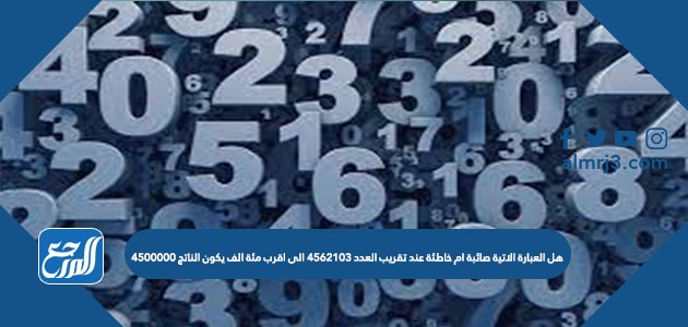 عند التقريب لأي منزلة لا بدّ من النظرِ إلى قيمة الرقم الذي يسبقها، فإنْ كان الرقم أكبر مِنْ أو يُساوي العدد 5 فإنّه يزيد بنسبةِ واحد، وإنْ كان أقلُ من العدد 5 فإنّ الرقم يبقى كما هو، وفي سؤالِ هل العبارة الاتية صائبة ام خاطئة عند تقريب العدد 4562103 الى اقرب مئة الف يكون الناتج 4500000 أم لا ؟