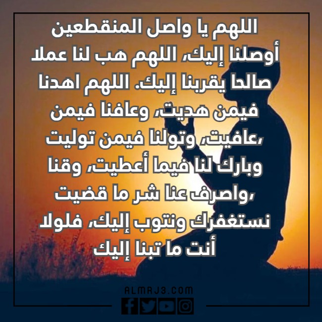 - “اللهم يا واصل المنقطعين أوصلنا إليك، اللهم هب لنا عملا صالحا يقربنا إليك. اللهم اهدنا فيمن هديت، وعافنا فيمن عافيت، وتولنا فيمن توليت، وبارك لنا فيما أعطيت، وقنا واصرف عنا شر ما قضيت، نستغفرك ونتوب إليك، فلولا أنت ما تبنا إليك”.