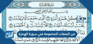 من الصفات المذمومة في سورة الهمزة، فالقرآن الكريم الكتاب الأول للمسلمين ومصدر تشريعهم ودستور حياتهم، وقد جعل الله -سبحانه وتعالى- فيه كلّ القوانين والأنظمة التي على المسلمين اتّباعها، وإنّ الدّين الإسلامي يحثّ على الصّفات الحميدة ويأمر بالاتّصاف بها، ويحذّر من الصّفات الذّميمة وينهى عن الاتّصاف بها والاتيان بما يشابهها، وذلك بما يحقّق المنفعة على المجتمعات الإسلاميّة والمسلمين، وفي هذا المقال يبيّن موقع المرجع بعض الصفات المذمومة في سورة الهمزة.
