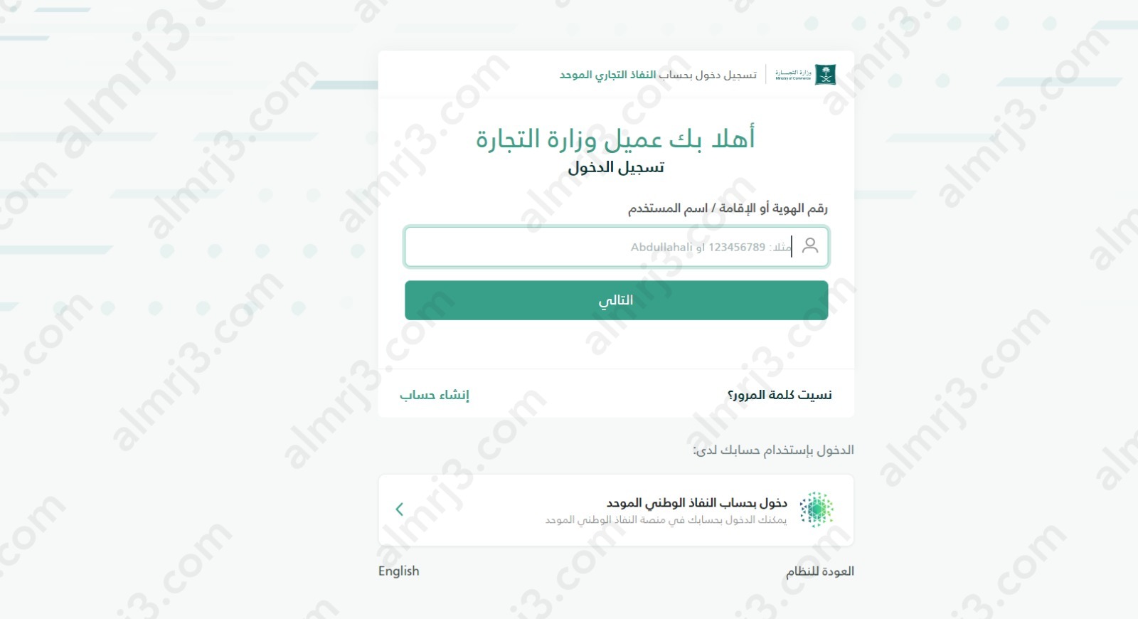 - تسجيل الدخول إما بحساب النّفاذ الوطني الموحد أو بحساب العميل في وزارة التجارة كما يأتي:
