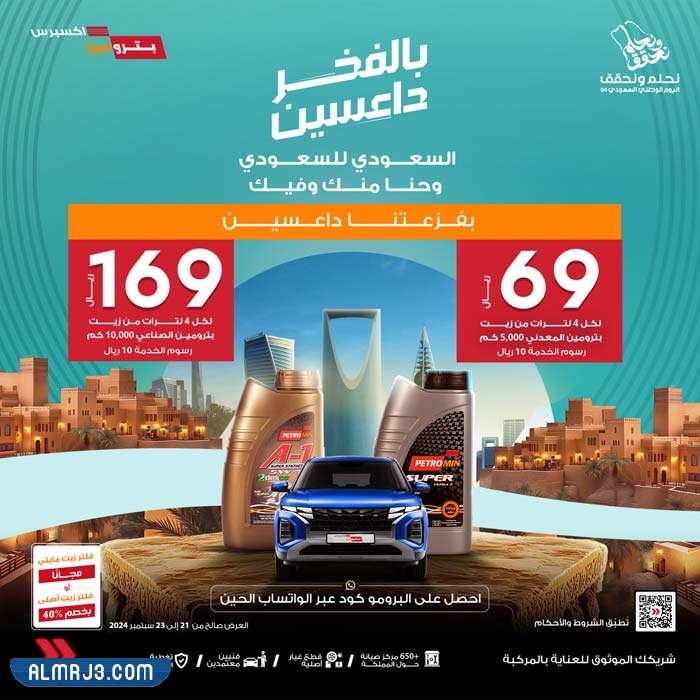 ุฅููู ุนุฑูุถ ุจุชุฑูู ูู ุงูููู ุงููุทูู 94 ูู ุนุฑูุถ ุนูู ุตูุงูุฉ ุงูุณูุงุฑุงุช ุจู ูุงุณุจุฉ ุงูููู ุงููุทูู ุงูุณุนูุฏูุ ุญูุซ ูุงู ุช ุดุฑูุฉ ุจุชุฑูู ูู ุจุงูุฅุนูุงู ุนู ู ุฌู ูุนุฉ ู ู ุงูุนุฑูุถ ุงูุชุงููุฉ: